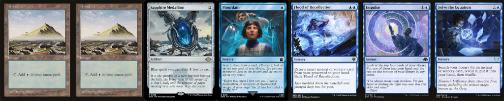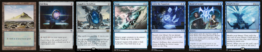 Sol Ring is a card that I’ve been thinking about for years. For a long time it has been very close to worth it, but always felt clunky. With the addition of Sapphire Medallion it finally earns its keep as one of the most powerful cards in the format. Getting the ability to play an early medallion with excess mana gives the deck an absurd amount of velocity it didn’t have before. Additionally, being able to cast the likes of Solve the Equation, Commit, Gifts Ungiven, and even Frantic Search earlier than you should opens up endless possibilities and makes it infinitely more difficult for your opponent to interact with you.