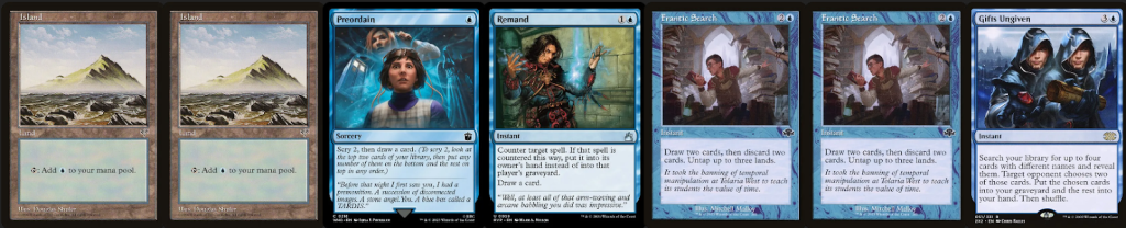 Casting Gifts Ungiven on your opponent’s end step to set up a winning turn is a difficult task. Specifically, if you are without access to a High Tide and tight on mana there’s not a lot of great options. If you have one or more Medallions online a similar pile to the one above to guarantee access to a Tide for relatively cheap. If not, it might be better to find a pile like Impulse, Trade Secrets, Frantic Search, and Dig Through Time to give yourself access to a minimum of three new cards (Impulse + Frantic).